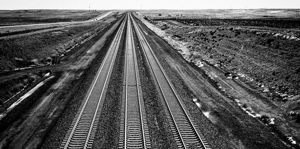 Rail line for coal cars leaving the Powder River Basin in Wyoming traveling west to Lummi Reservation on Puget Sound Washington 2013.
