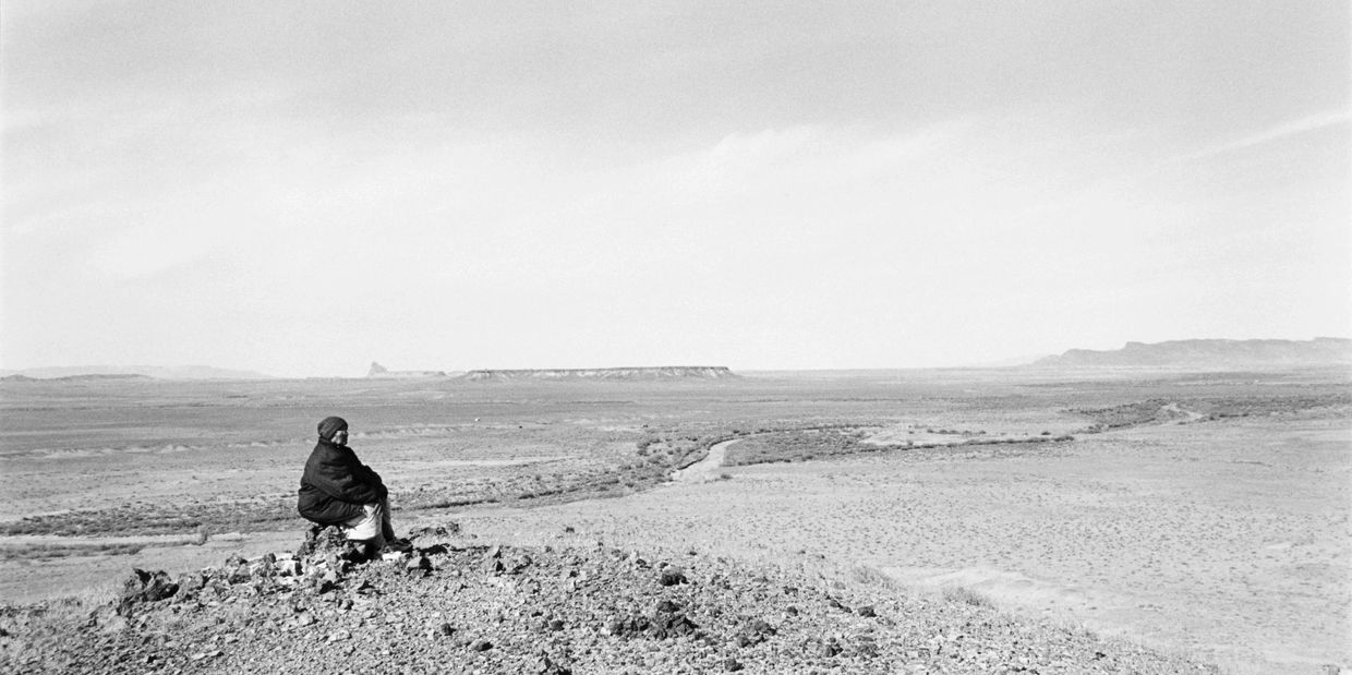 Lucy A. Willie sits at an eagle nesting area overlooking the proposed site of the Desert Rock Power Plant near Chaco Wash on the Navajo Nation in New Mexico. Shiprock appears on the horizon. 2004